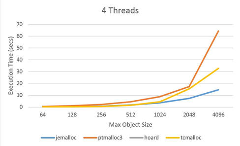 Jemalloc, hoard and tcmalloc scale well for this test due to their contention free designs.